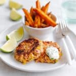 6. Serve: Serve two patties per person alongside the crispy sweet potato chips. Add lime wedges for squeezing over the fish cakes and a dollop of mayonnaise mixed with wasabi on the side, if desired, for an added kick.