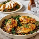 This Schmaltzy lentils with chicken, olives, and lemon recipe combines tender chicken breasts with flavorful tomato-infused lentils, earthy kale, tangy olives, and bright lemon. Cooked in a single pan, the dish is seasoned with aromatic spices like sumac and turmeric, resulting in a rich, hearty meal that’s perfect for a comforting dinner.