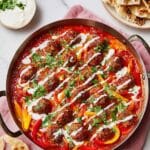 Shakshuka meatballs are a flavorful twist on the classic North African and Middle Eastern shakshuka, featuring spiced juicy meatballs simmered in a rich, aromatic tomato and pepper sauce. This comforting one-pan dish is perfect for a hearty dinner and is served with a dollop of natural yogurt and crusty bread for dipping.