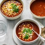 Keywords: smoky tomato soup, chipotle soup, charred corn soup, vegetarian soup, spicy tomato soup, healthy soup recipe, Greek yogurt topping, feta cheese soup