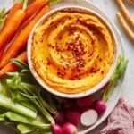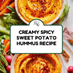 This Spicy Sweet Potato Hummus is a vibrant twist on the classic dip, blending the natural sweetness of roasted sweet potatoes with smoky paprika and a hint of chili heat. Creamy tahini and fresh lemon juice add depth and brightness, making it perfect for serving with crunchy vegetable crudités, breadsticks, crackers, or olives.