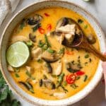 A rich and spicy Thai-inspired Tom Kha soup featuring creamy coconut, tender chicken breasts, flavorful herbs, and a hint of heat from Fresno chilies and red Thai curry paste. This comforting soup balances citrusy lime juice, savory fish sauce, and aromatic lemongrass for an authentic and satisfying meal.