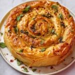 - Bake the whirl: Brush the entire filo spiral generously with melted butter, then sprinkle with chilli flakes. Bake in the preheated oven for 50-60 minutes until the filo is deep golden brown and crisp.