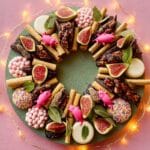 This Sweet Grazing Wreath is a delightful and visually stunning dessert centerpiece perfect for festive occasions. Combining a crunchy chocolate salami made from biscuits, pretzels, dark chocolate, and golden syrup, along with vibrant jazzies and chocolate coins, this wreath is accented with fresh figs, bay leaves, and whimsical pink sugar mice for an elegant and fun presentation.