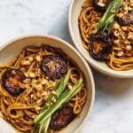 Keywords: shiitake mushrooms, asian noodles, baked mushrooms, peanut sauce, vegetarian noodles, takeaway-style recipe