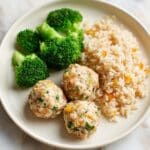 A gentle and nutritious weaning recipe featuring tender chicken meatballs made with finely chopped chicken thighs, celery, carrot, and chives. These meatballs are oven-baked to perfection and served alongside boiled rice and steamed broccoli, perfect for introducing solid foods to babies and toddlers while offering a wholesome meal for the whole family.