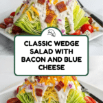 This classic Wedge Salad features crisp iceberg lettuce quarters dressed with creamy bleu cheese dressing, diced cherry tomatoes, finely chopped red onion, crispy bacon crumbles, shredded cheddar cheese, and optional crumbled bleu cheese for extra tang. It’s a refreshing and simple salad perfect as a starter or light meal.